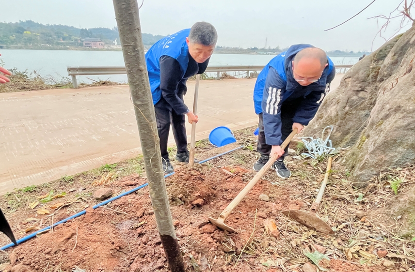 活动现场,职工志愿者们干劲十足,手持铁锹、锄头等工具,齐心协力置苗、扶正、填土、踩实、浇灌。经过两个多小时的努力,共栽植红枫、红叶李、银桂、紫薇等数十棵,新种下的树苗在春风中展现出勃勃生机。