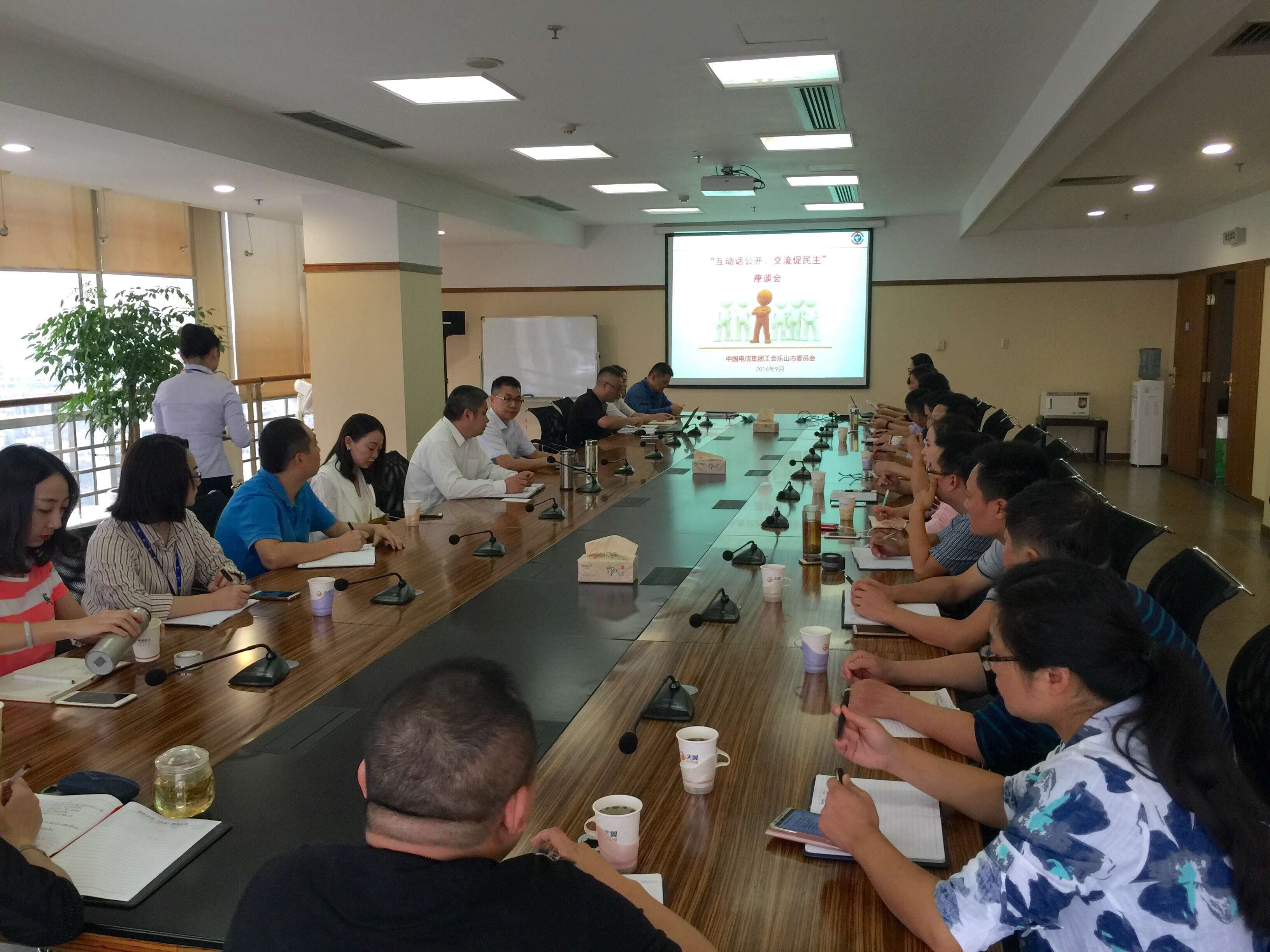2016年9月29日,乐山电信公司召开“互动话公开、交流促民主”座谈会,乐山电信公司李华良总经理、杨毅工会主席、各部门工会主席、党群监察室、人力资源部、建设部、采购中心负责人以及6名职工代表和6名一线员工近三十人参加。