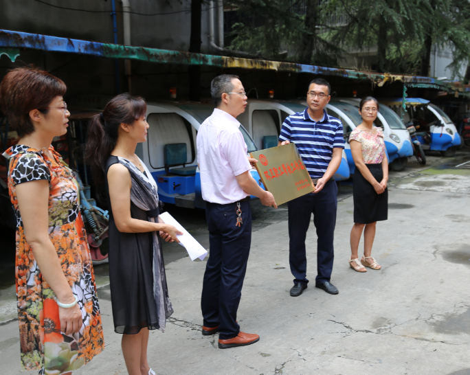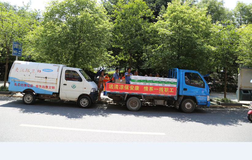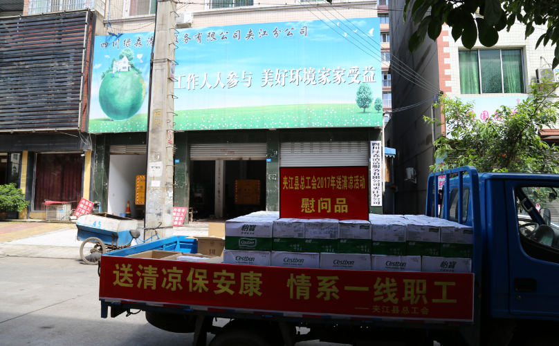 7月24日,烈日炎炎,夹江县总工会和县城管局领导来到县环卫所,为环卫职工送去矿泉水、藿香正气水、清热解毒口服液、白糖等消暑降温物质,并为“夹江县环卫职工帮扶工作站”授牌,标志着该工作站正式成立。