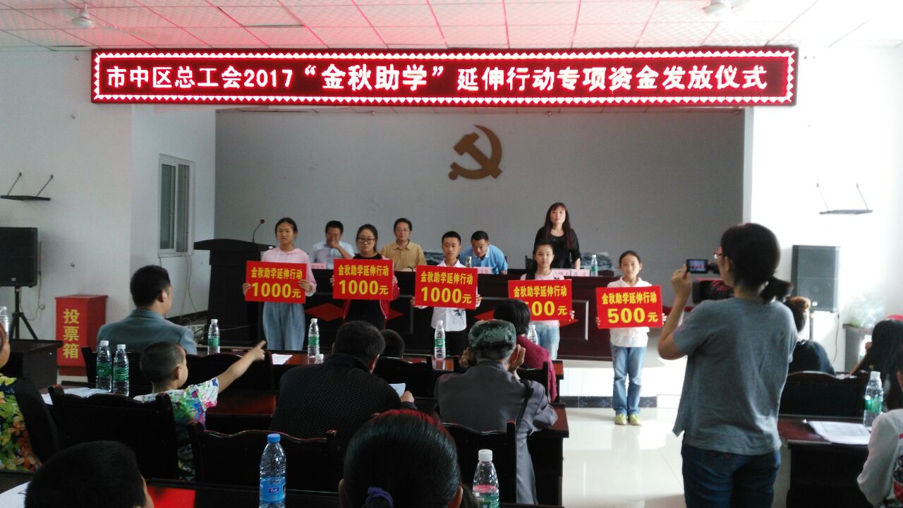 今秋以来,市中区总工会按照乐工办发[2017]21号《乐山市总工会办公室关于实施2017年金秋助学项目的通知》精神,做好“金秋助学”和“金秋助学延伸行动”,共筹集资金23.8万元,资助182名困难职工(农民工)子女上学。