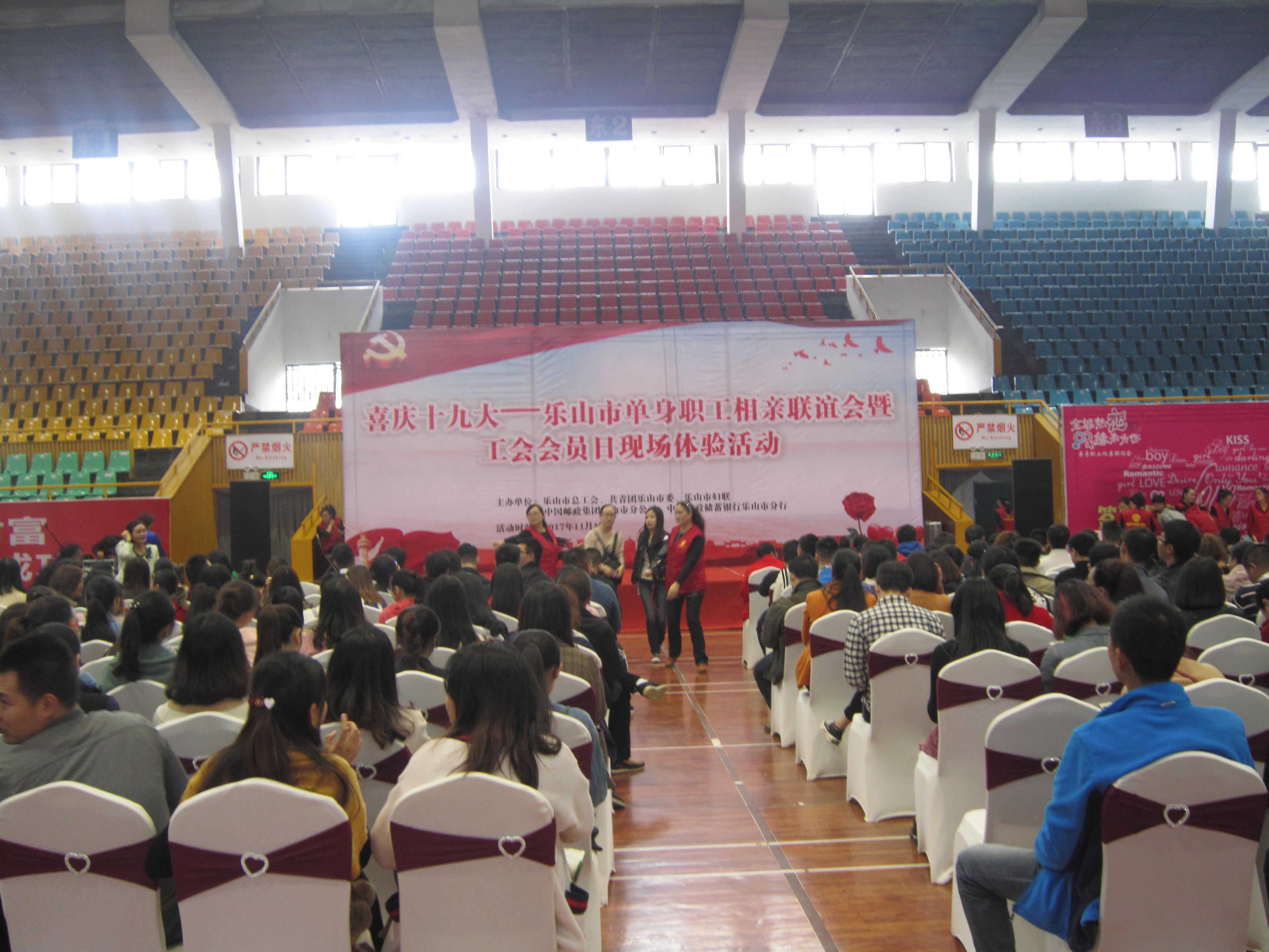 11月10日,由乐山市总工会、共青团乐山市委、乐山市妇联、中国邮政集团乐山市分公司、中国邮政储蓄银行乐山市分行主办,乐山市市中区区总工会承办的“庆十九大——乐山市单身职工相亲联谊会暨工会会员日现场体验活动”在乐山市体育馆举行,来自乡镇、街道、教育及行业工会的200余名职工参加此次现场体验活动。
