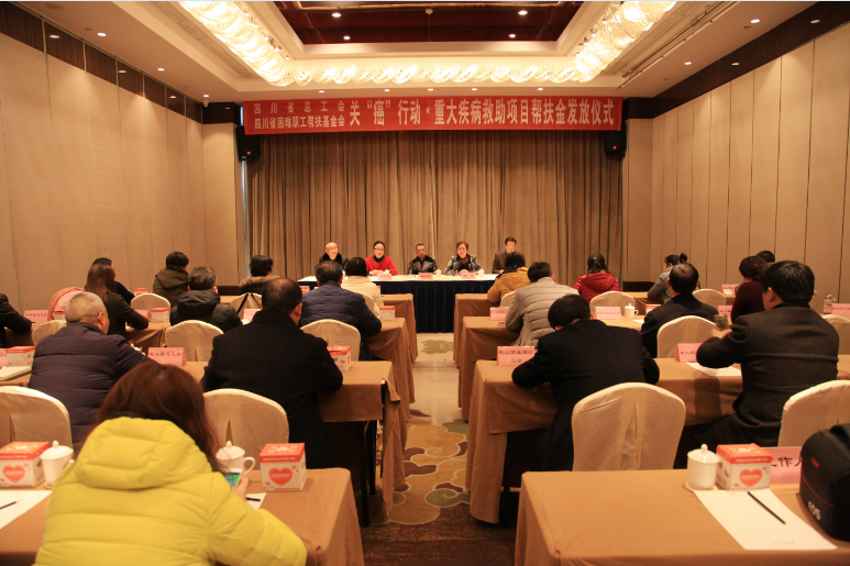 12月14日,四川省总工会、省困难职工帮扶基金会关“癌”行动·重大疾病救助项目帮扶资金发放仪式在乐山举行。省总党组成员、副主席任远明出席并作讲话,省困难职工帮扶基金会理事长邹游通报基金会工作情况,乐山市总工会党组书记、常务副主席王学东致辞。省总相关部室负责人,乐山市总工会在家班子成员及部室负责人,乐山各区县总工会负责人,受助职工代表等参加仪式。