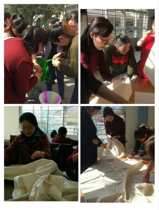 活动中,大家认真描图设计、扎结、染色、浸泡、剪线……一件件艺术品在大家共同的努力下出炉了!因在制作过程中每个人扎结的形状不同、图案不同、扎结的松紧不同、浸染的时间也不同……因此产生深浅虚实、变化多端的色晕,染成的图案纹样神奇多变,色泽鲜明,图案简洁质朴,且有令人惊叹的艺术魅力。每个人染出来的作品都是独一无二的艺术品。她们一边笑着欣赏作品,一边把它们挂起来,相互分享着喜悦。