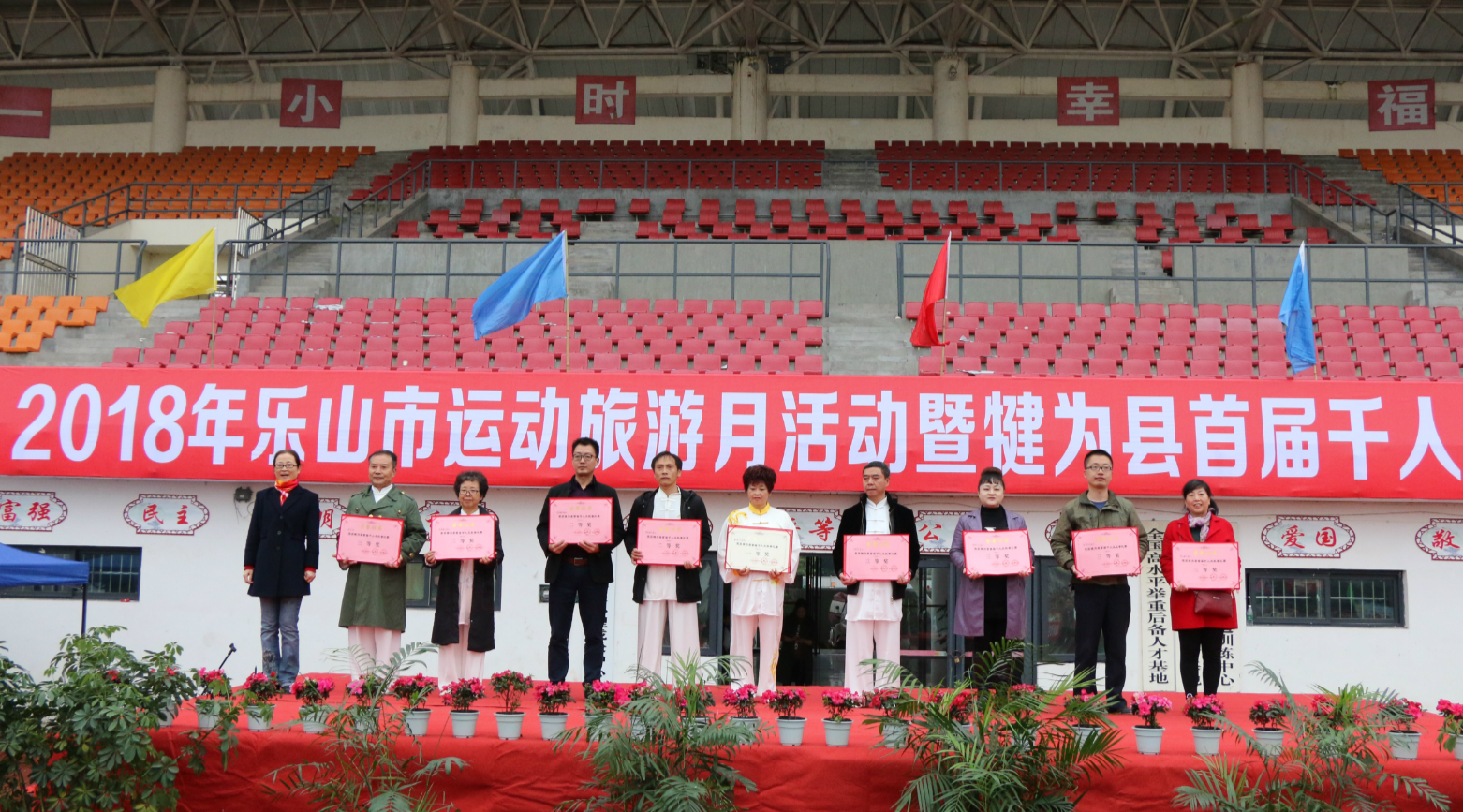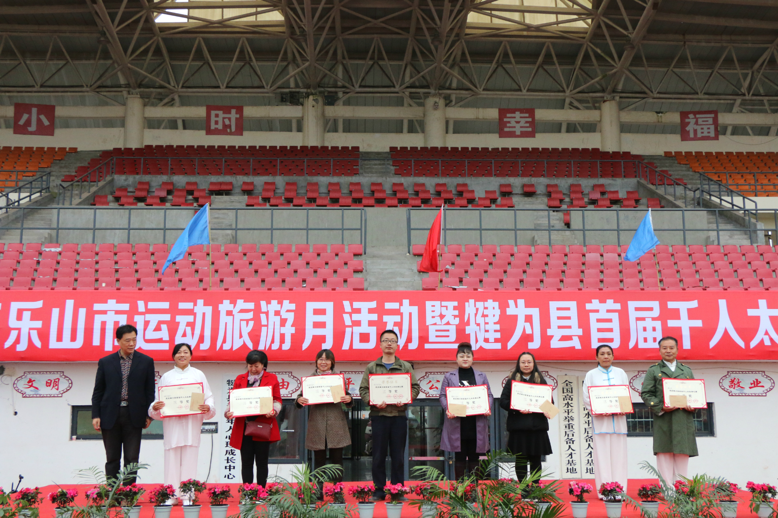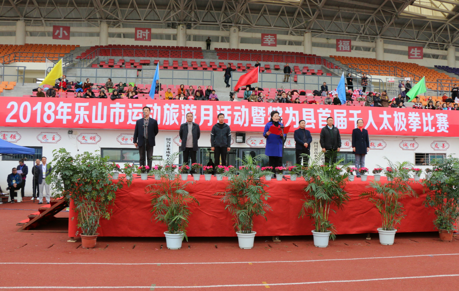 为贯彻落实《全民健身条例》《“健康中国2030”规划纲要》的战略部署,传承弘扬中华民族文化瑰宝,推广科学健身理念,倡导健康生活,展示全县广大干部职工积极向上的精神风貌,11月9日,由乐山市旅游和体育发展委员会、犍为县人民政府主办,犍为县委宣传部、犍为县总工会、犍为县教育体育局承办的2018年乐山市运动旅游月活动暨犍为县首届千人太极拳比赛在县文体中心成功举行。