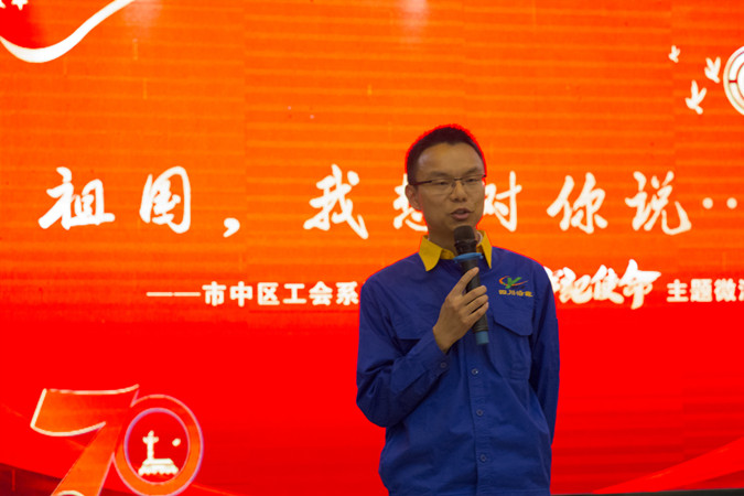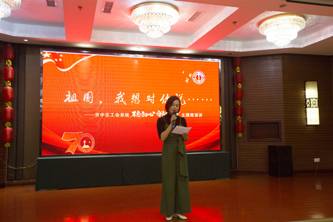 2019年9月24日下午,为迎接新中国70诞辰,市中区总工会举办了“祖国,我想对你说....”——全区工会系统“不忘初心、牢记使命”主题微演讲,区总工会党支部全体党员,以及来自全区各行业职工代表60余人到场参加。区委常委、区总工会主席李向红出席了活动。