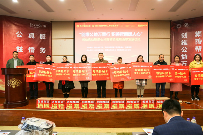 仪式现场,深圳创维集团四川分公司为峨眉山市有购买创维家电需求的职工提供了“乐山市长专项补贴卡”6500张,总价值300余万元,创维集团乐山分公司向峨眉山市困难职工捐赠了智能电饭煲、冰箱、微波炉等物资。
